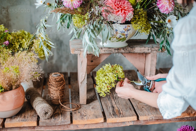 Женский профессиональный флорист готовит композицию из полевых цветов