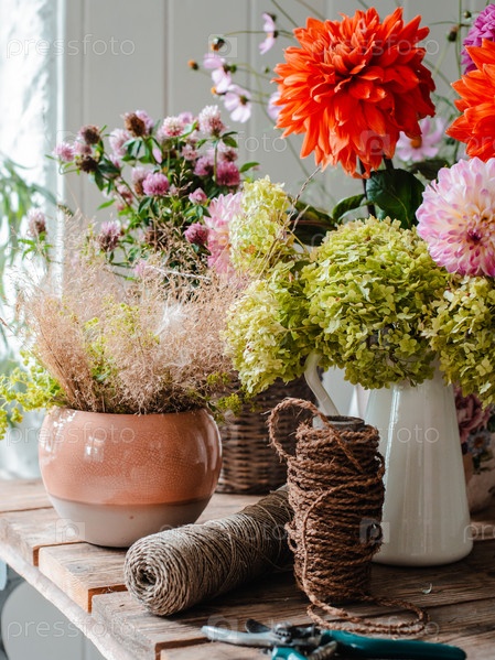Большая цветочная композиция букет на рабочем столе флориста на фоне бетонной стены