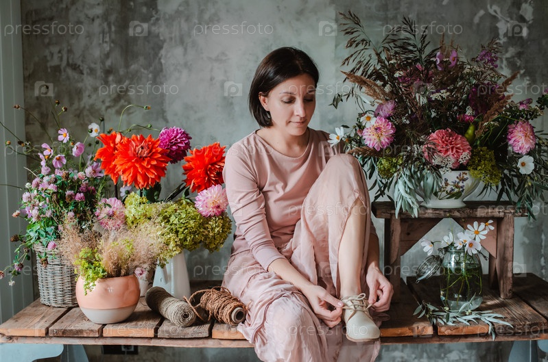 Женщина-профессиональный флорист с юмором позирует с цветами глазами, сидя за деревянным столом с композициями из полевых цветов