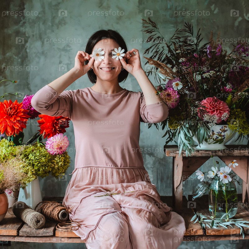 Женщина-профессиональный флорист с юмором позирует с цветами глазами, сидя за деревянным столом с композициями из полевых цветов