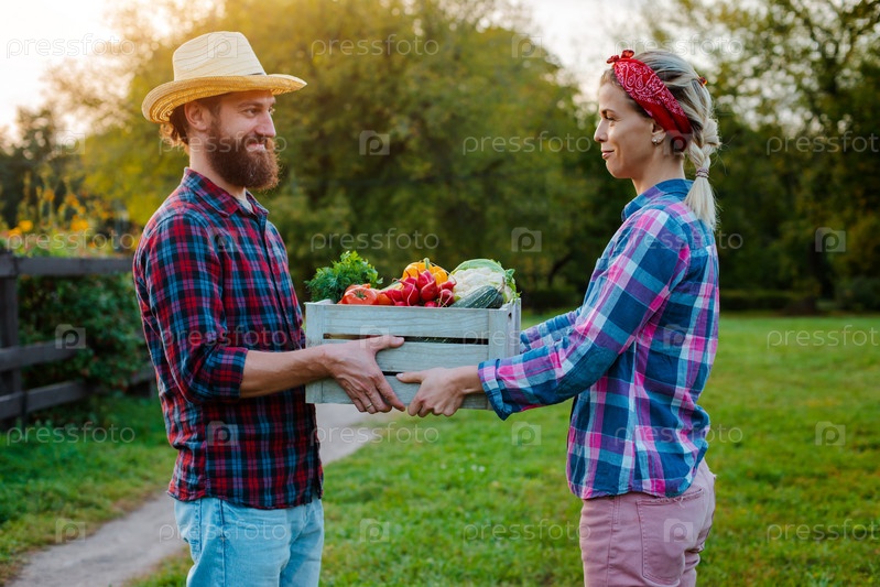 Мужчина и женщина держат коробку с урожаем сельскохозяйственных овощей на фоне сада