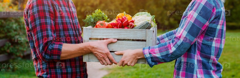 Мужчина и женщина держат коробку с урожаем сельскохозяйственных овощей на фоне сада