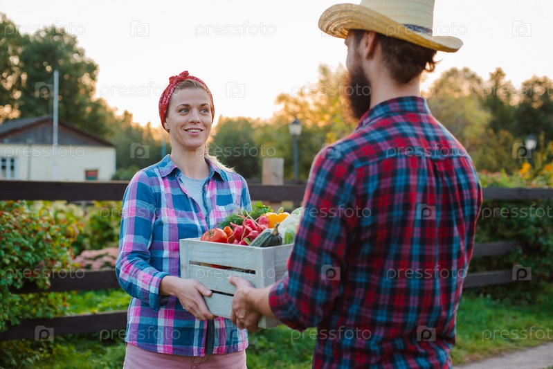 Мужчина и женщина держат коробку с урожаем сельскохозяйственных овощей на фоне сада