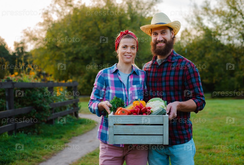 Мужчина и женщина держат коробку с урожаем сельскохозяйственных овощей на фоне сада