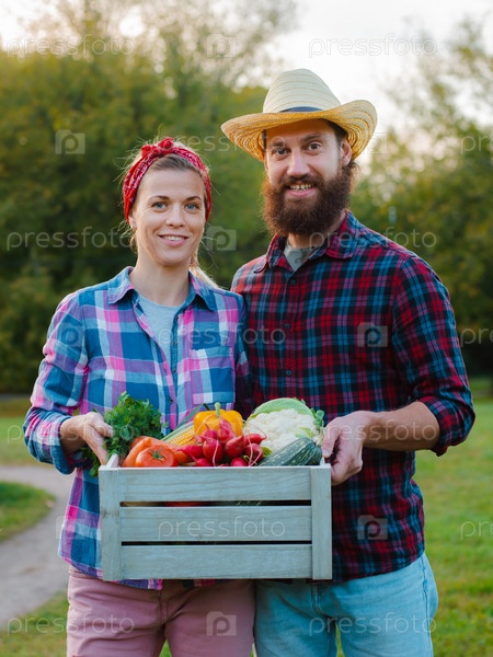 Мужчина и женщина держат коробку с урожаем сельскохозяйственных овощей на фоне сада
