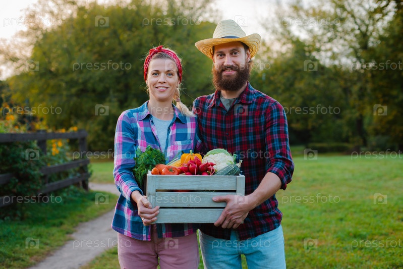 Мужчина и женщина держат коробку с урожаем сельскохозяйственных овощей на фоне сада