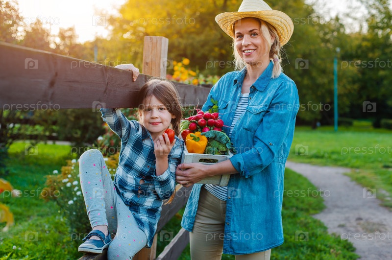 Дети маленькая девочка держит маму корзину свежих органических овощей с домашним садом