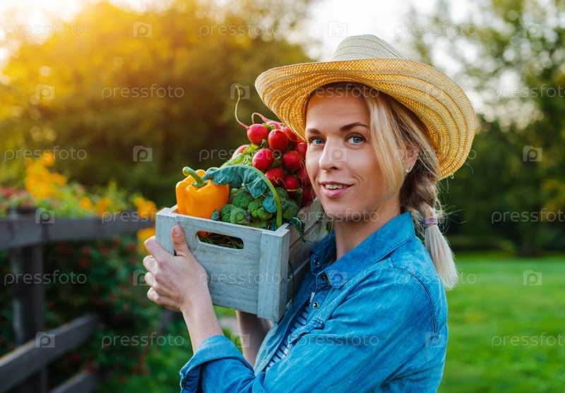 Молодая красивая женщина 30-35 лет в шляпе с коробкой свежих экологических овощей на фоне сада на закате