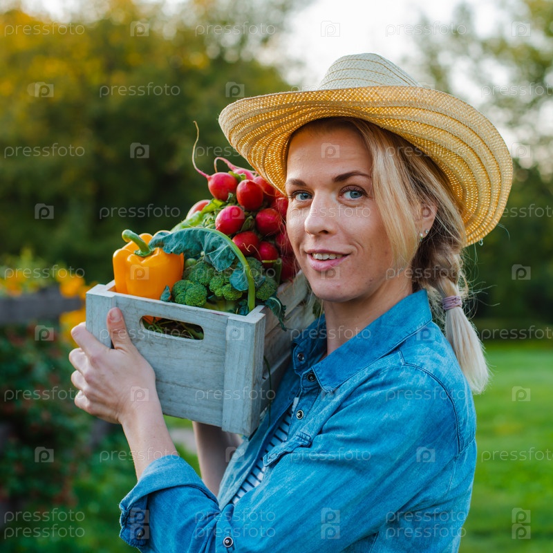 Молодая красивая женщина 30-35 лет в шляпе с коробкой свежих экологических овощей на фоне сада на закате