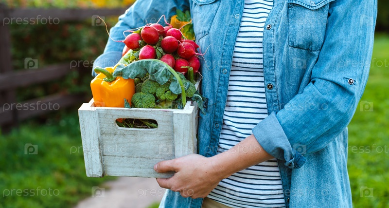 Молодая красивая женщина 30-35 лет в шляпе с коробкой свежих экологических овощей на фоне сада на закате