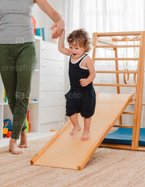 Ребенок в раннем возрасте 1,5 лет занимается в домашнем детском деревянном спортивном комплексе