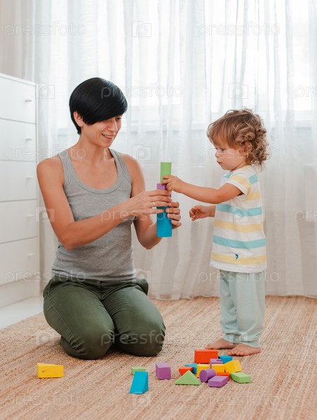 Мать и ребенок играют на полу в детской. Мама и маленький мальчик строят башню из цветных блоков