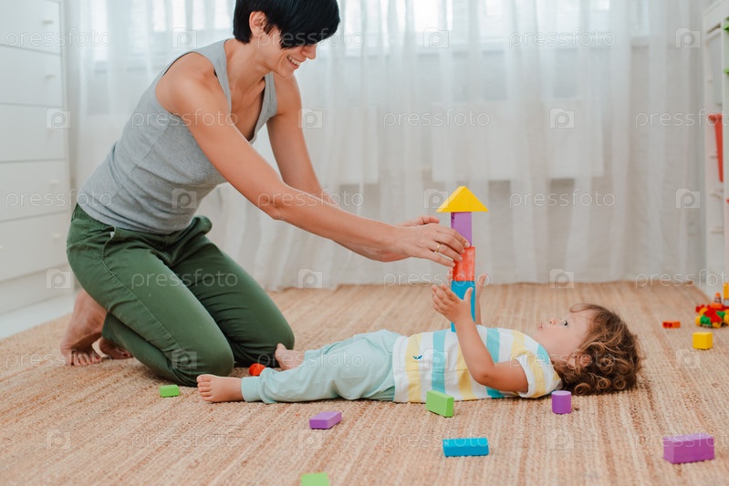 Мать и ребенок играют на полу в детской. Мама и маленький мальчик строят башню из цветных блоков