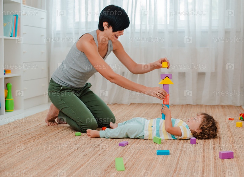 Мать и ребенок играют на полу в детской. Мама и маленький мальчик строят башню из цветных блоков