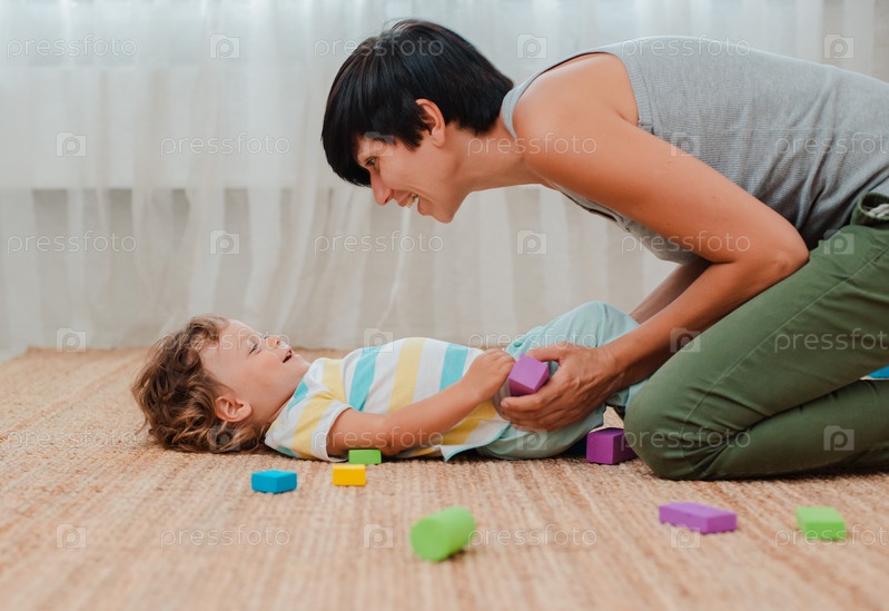 Мать и ребенок играют на полу в детской. Мама и маленький мальчик строят башню из цветных блоков