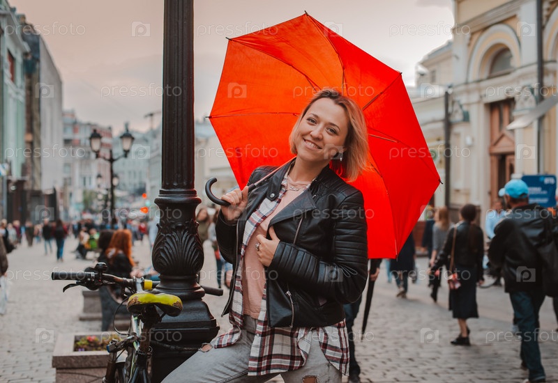 Молодая жизнерадостная женщина под красным зонтиком в центре города осенью