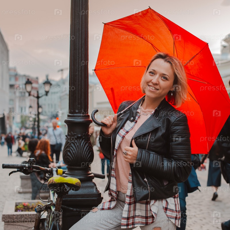 Молодая жизнерадостная женщина под красным зонтиком в центре города осенью