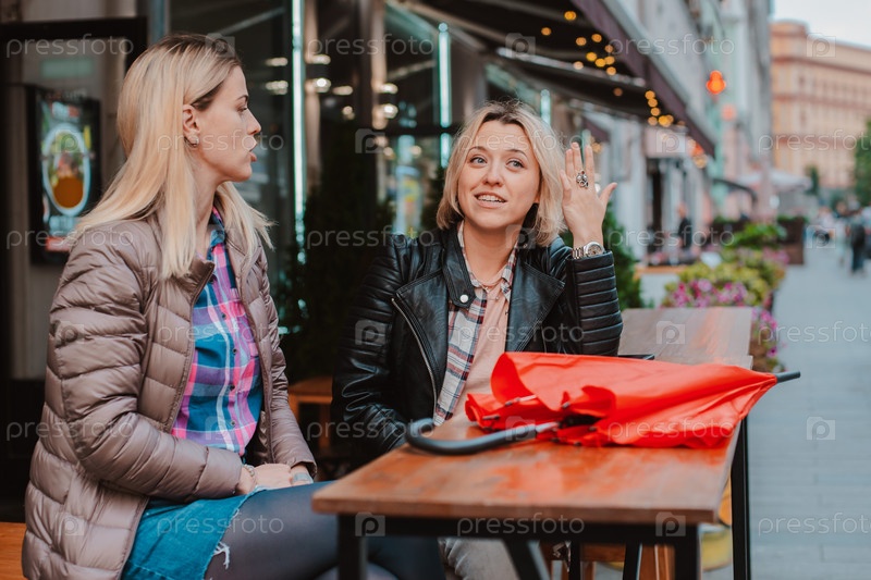 Две молодые подруги встретились в городском уличном кафе и весело поболтали