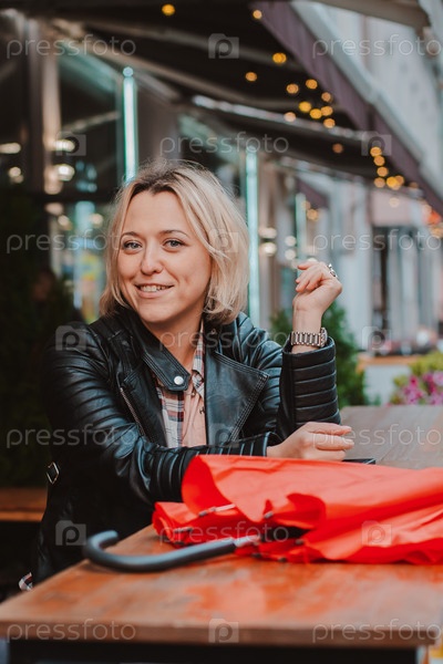 Европейская блондинка ест рис Фо Бо с деревянными палочками за столом уличного вьетнамского кафе в Москве