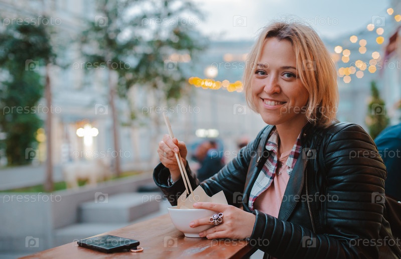 Европейская блондинка ест рис Фо Бо с деревянными палочками за столом уличного вьетнамского кафе в Москве