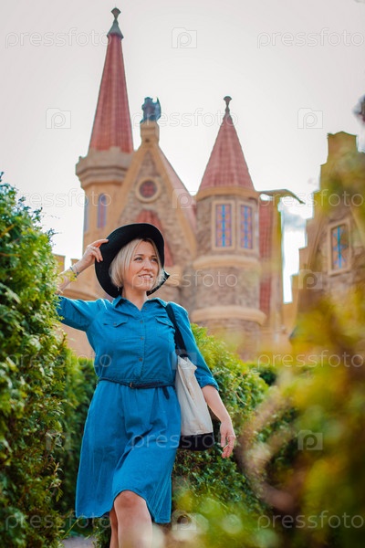 Портрет молодой красивой модной счастливой женщины, позирующей на улице на фоне средневекового Старого города