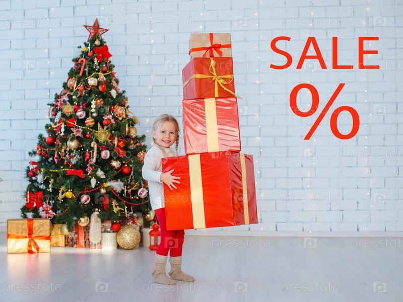 Маленькая девочка держит в руках башню из красных подарочных коробок на рождественском фоне белой кирпичной стены и украшенного