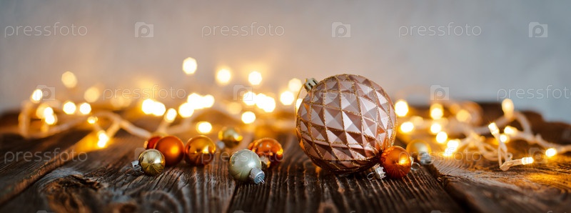 Рождественская елочная игрушка лежала на деревянном столе на фоне боке праздничных огней