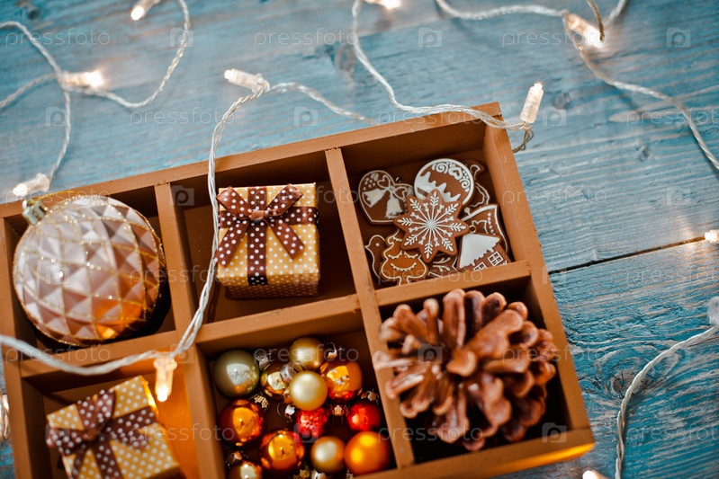 Рождественские украшения находятся в коробке на синем деревянном фоне