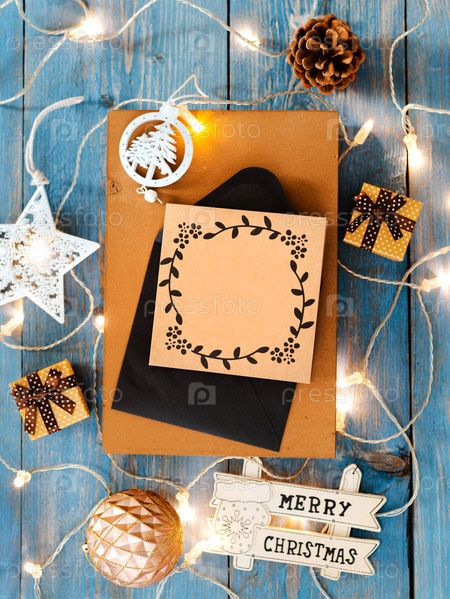 Новогодние украшения вокруг рождественского письма пустое место для текста горящие огни гирлянды на синем деревянном фоне