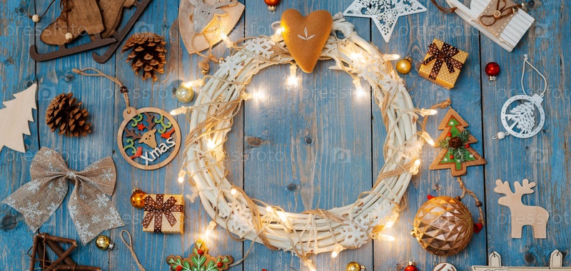 Новогодние украшения вокруг рождественского венка на синем деревянном фоне