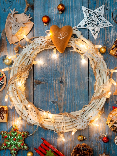 Новогодние украшения вокруг рождественского венка на синем деревянном фоне
