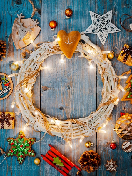 Новогодние украшения вокруг рождественского венка на синем деревянном фоне
