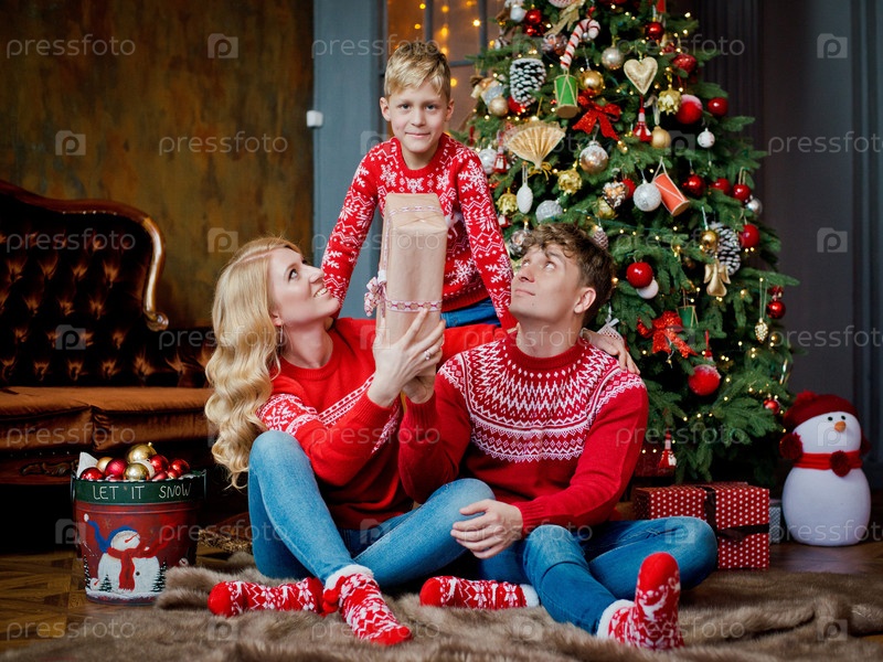 Рождественский семейный портрет в красных традиционных свитерах в гостиной домашнего праздника, родители и ребенок с подарочной коробкой