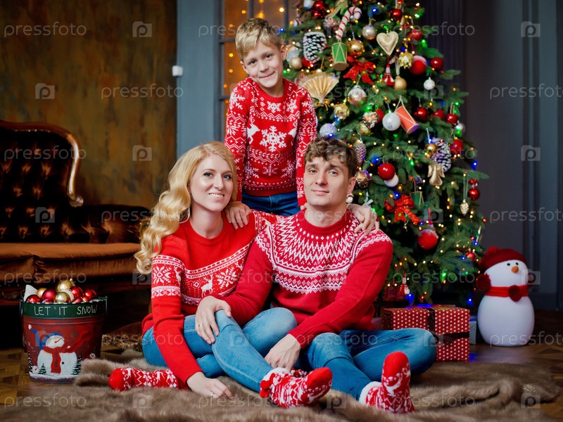 Рождественский семейный портрет в красных традиционных свитерах в гостиной домашнего праздника, родители и ребенок с подарочной коробкой