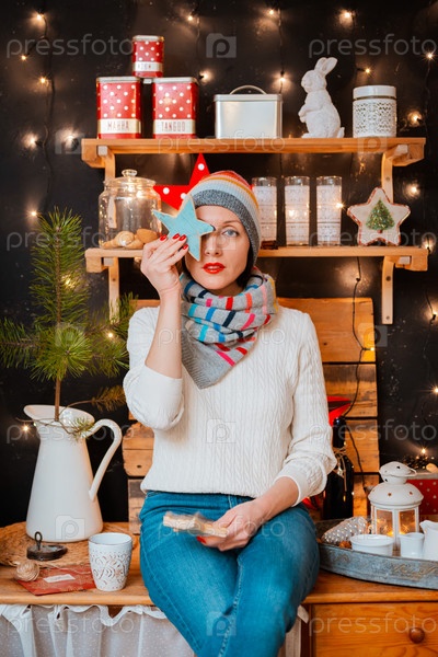 Женщина яркая шляпа кухонная плита. девушка готовит зимний вечер. деревянная деревенская кухня на черном фоне