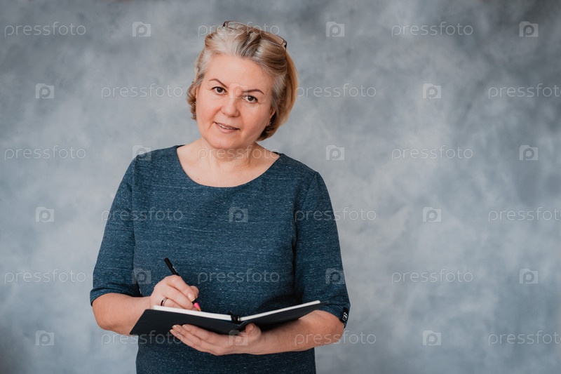 Портрет красивой деловой пожилой женщины на сине-сером фоне, смотрящей в камеру с ручкой