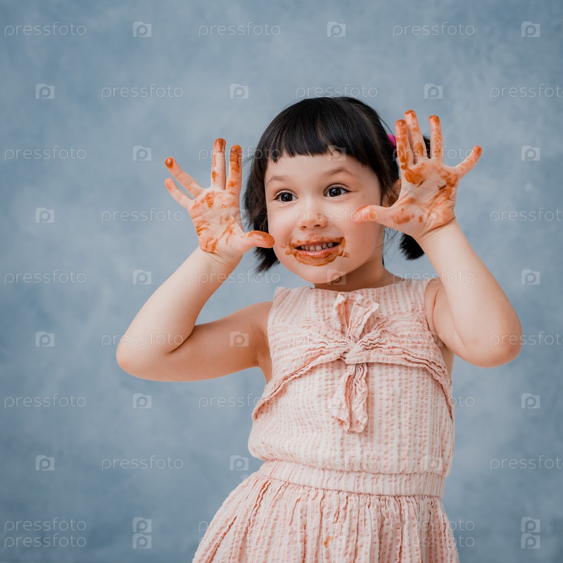 Маленькая девочка ест шоколад и облизывает палец на фоне серо-голубой студии. свободное место. Сладкоежка