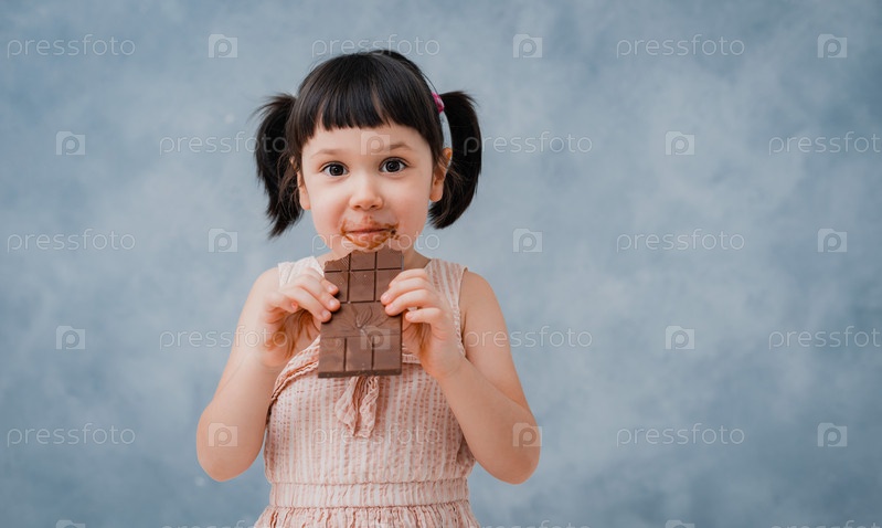 Маленькая девочка ест шоколад и облизывает палец на фоне серо-голубой студии. свободное место