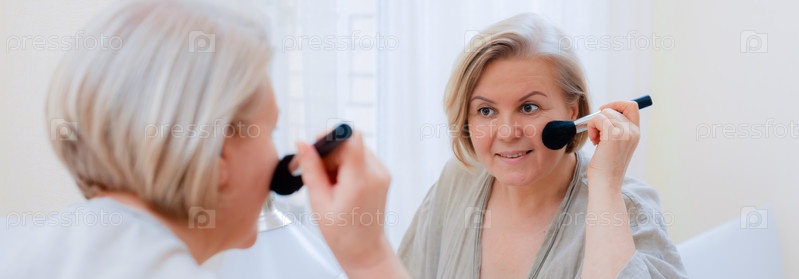 Портрет красивой пожилой женщины, касающейся ее идеальной кожи, смотрящей в зеркало. Крупный план лица зрелой женщины с кистью, касающейся кожи ее лица