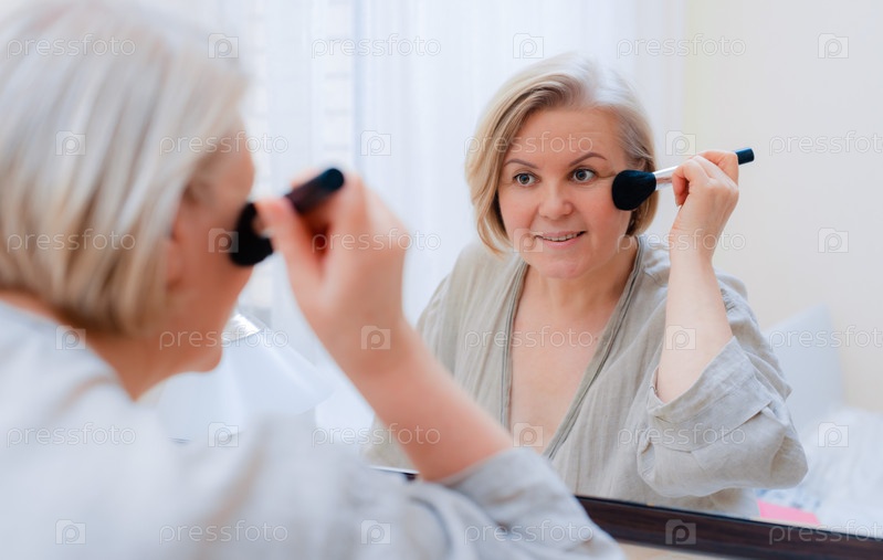 Портрет красивой пожилой женщины, касающейся ее идеальной кожи, смотрящей в зеркало. Крупный план лица зрелой женщины с кистью, касающейся кожи ее лица. концепция ухода за процессом старения заботится о коже