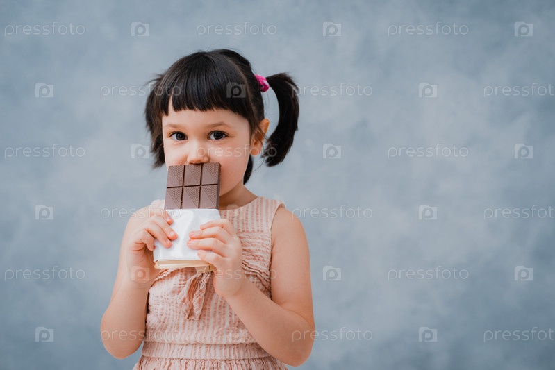 Маленькая девочка ест шоколад и облизывает палец на фоне серо-голубой студии. свободное место. Сладкоежка