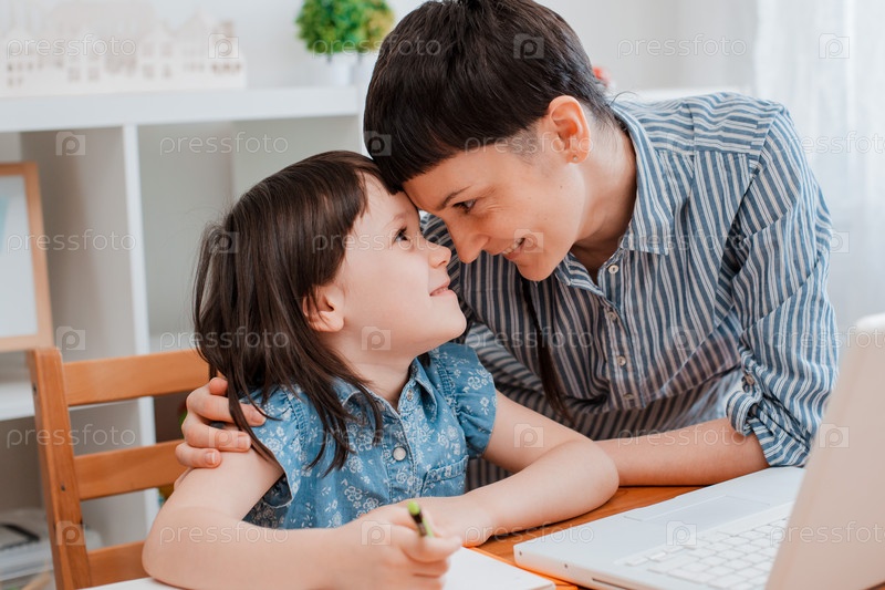 Ученик школы матери и ребенка дома на ноутбуке, изучая домашнюю работу. дистанционное домашнее обучение в период пандемии и коронавируса