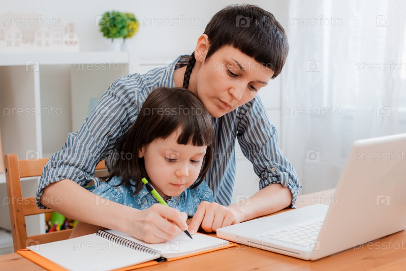 Ученик школы матери и ребенка дома на ноутбуке, изучая домашнюю работу. дистанционное домашнее обучение в период пандемии и коронавируса