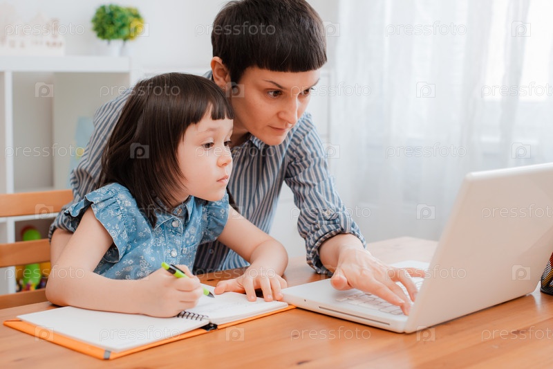 Ученик школы матери и ребенка дома на ноутбуке, изучая домашнюю работу. дистанционное домашнее обучение в период пандемии и коронавируса