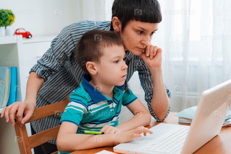 Ученик школы матери и ребенка дома на ноутбуке, изучая домашнюю работу. дистанционное домашнее обучение в период пандемии и коронавируса