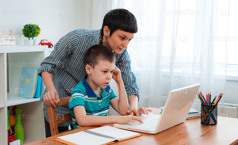 Ученик школы матери и ребенка дома на ноутбуке, изучая домашнюю работу. дистанционное домашнее обучение в период пандемии и коронавируса