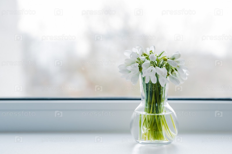 Красивый букет подснежников в стеклянной вазе возле окна на подоконнике. свободное пространство, фон