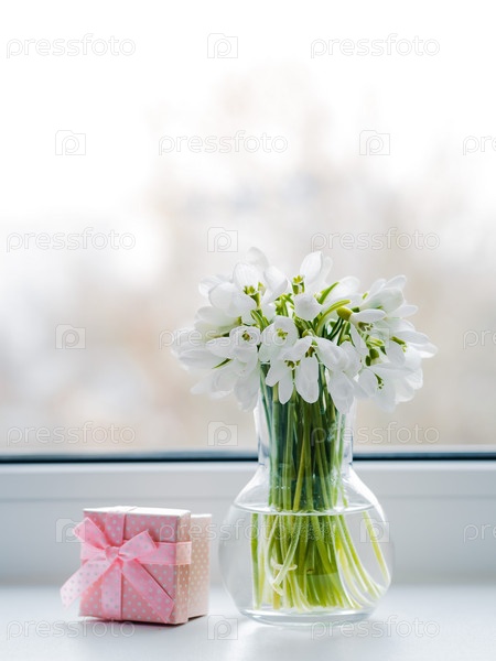 Красивые букеты подснежников в стекле в лучах весеннего солнца на подоконнике с розовой подарочной коробкой
