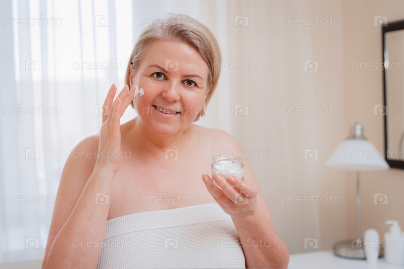 Улыбающаяся пожилая женщина наносит антивозрастной лосьон для удаления темных кругов под глазами