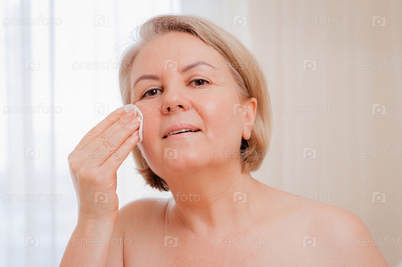 Улыбающаяся пожилая женщина наносит антивозрастной лосьон для удаления темных кругов под глазами